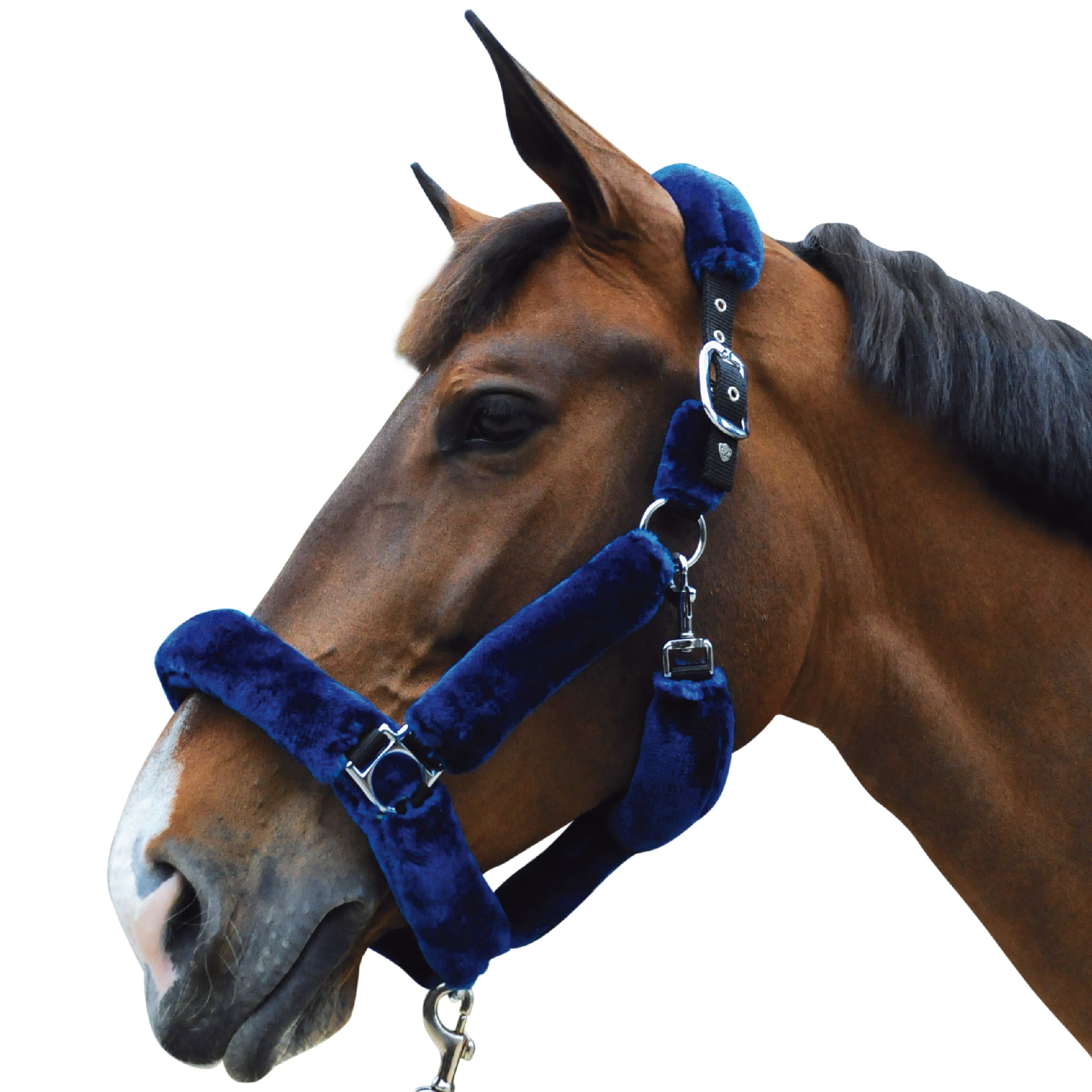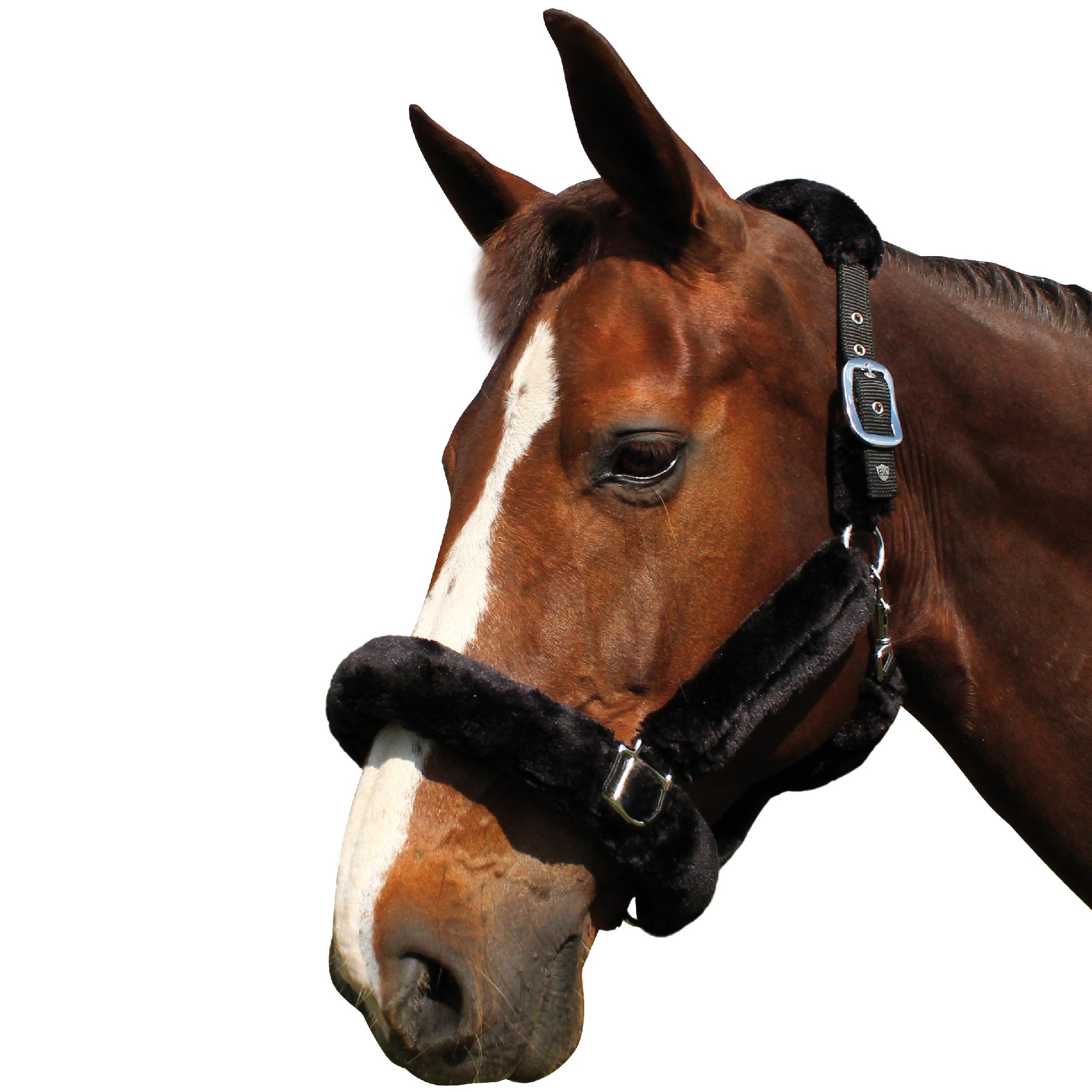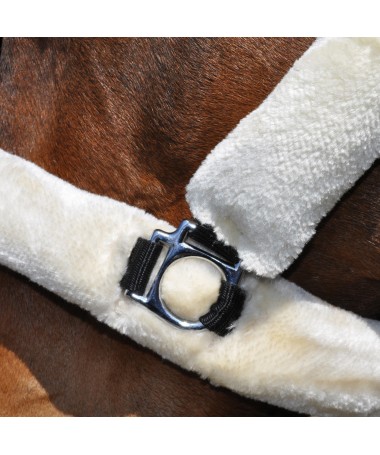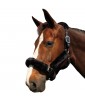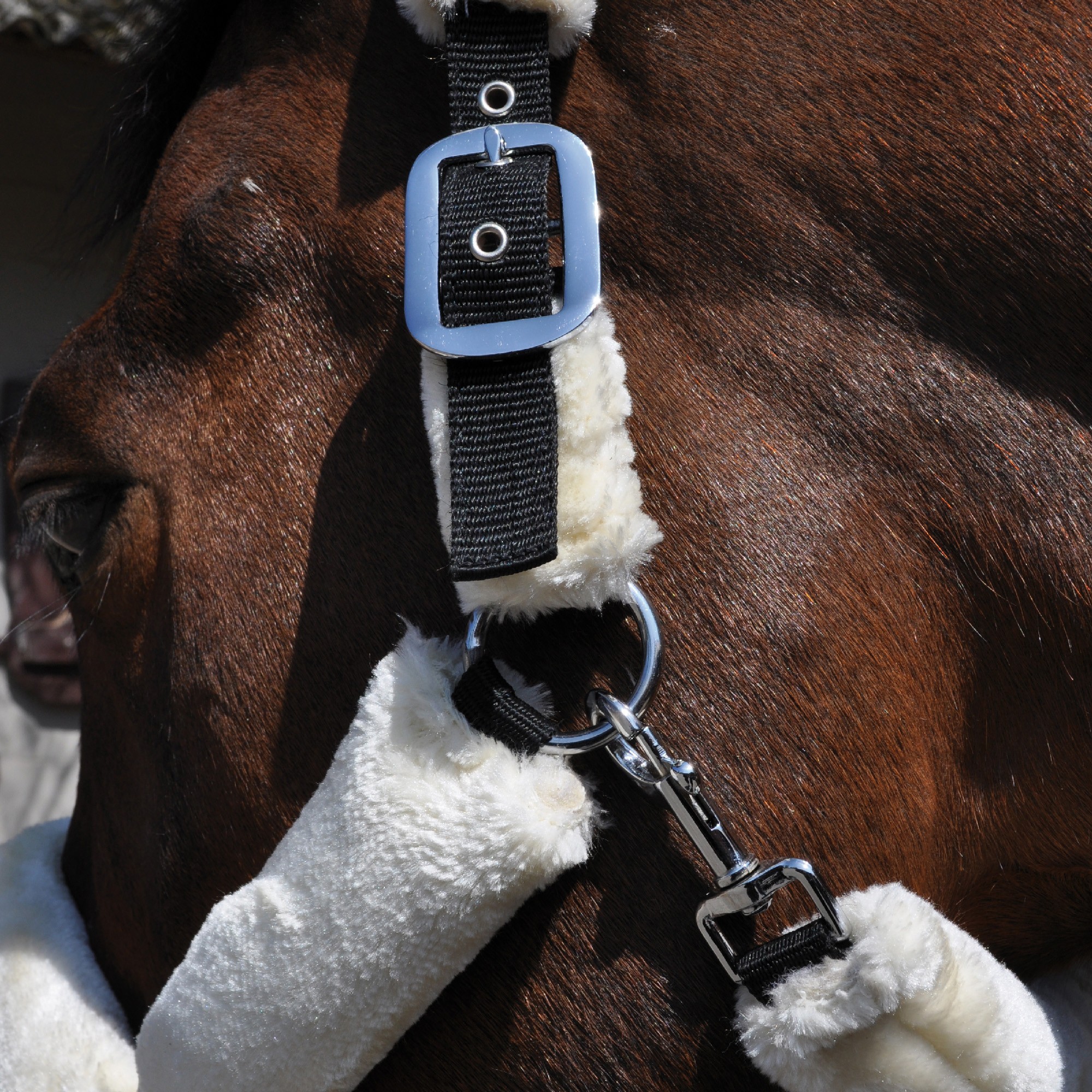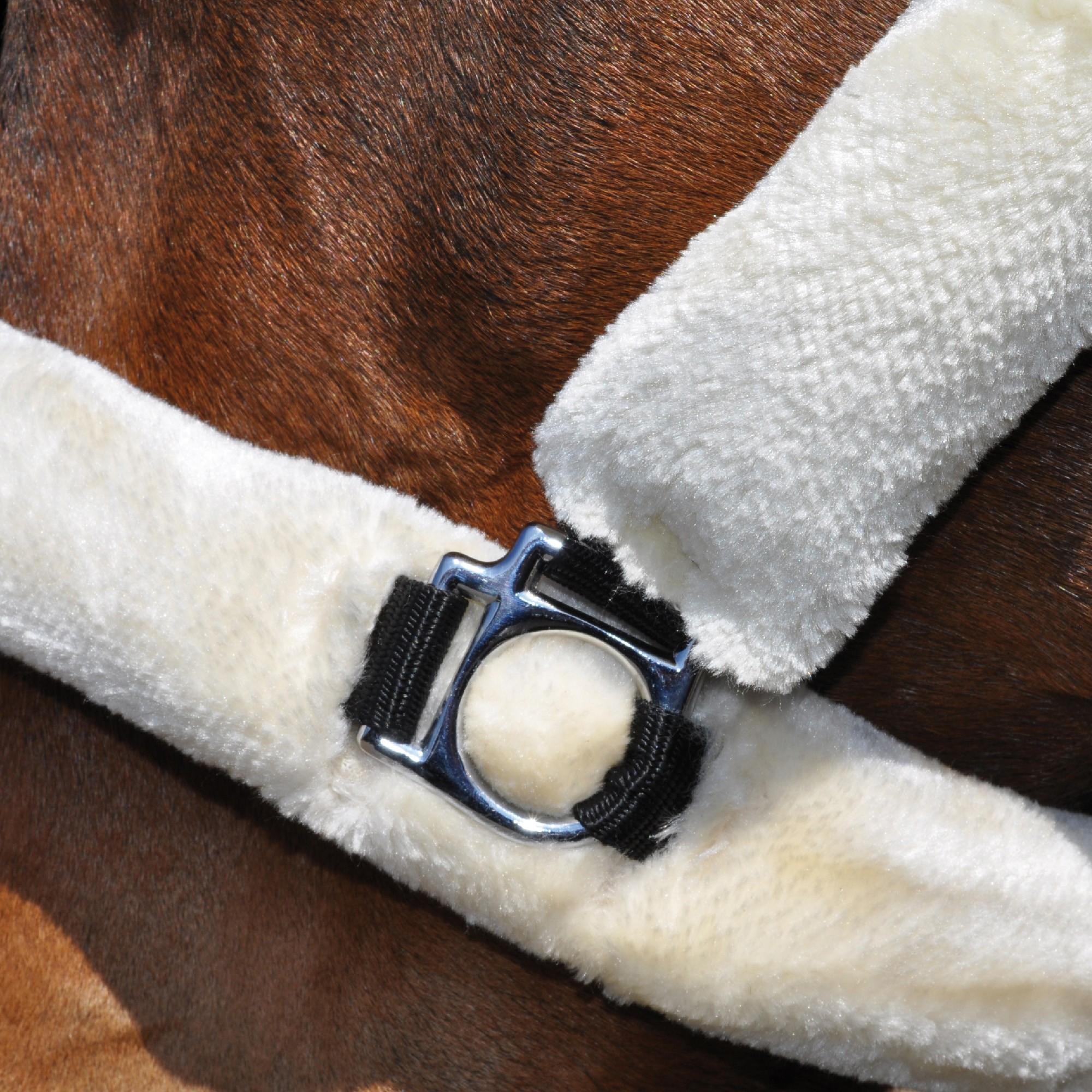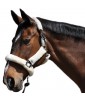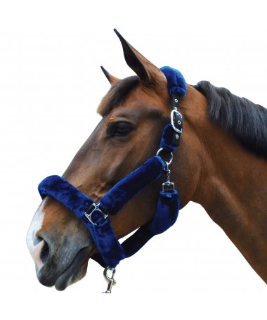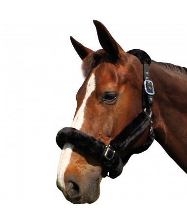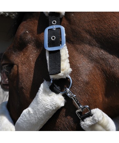 Black nylon halter, wrapped in synthetic sheepskin (3 colours available). Headpiece with 2 fitting buckles. Noseband with 1 fitting buckle. 1 fast opening snap. Stainless stell buckles.