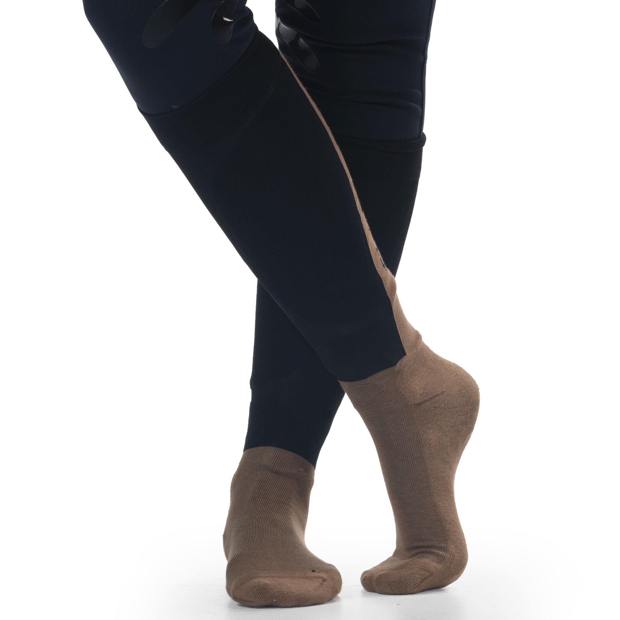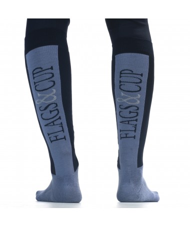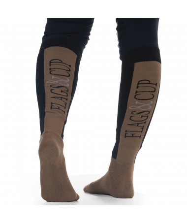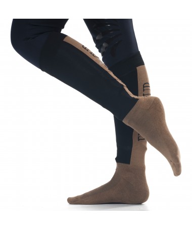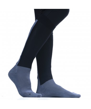 Especially adapted to horse riding, terry loop reinforcements have been added at point rests (floor and branches of stirrup); contact areas of spur, stirrup leathers and horse’s flanks. Anti-pleat tightenings at calf and foot.