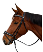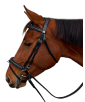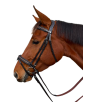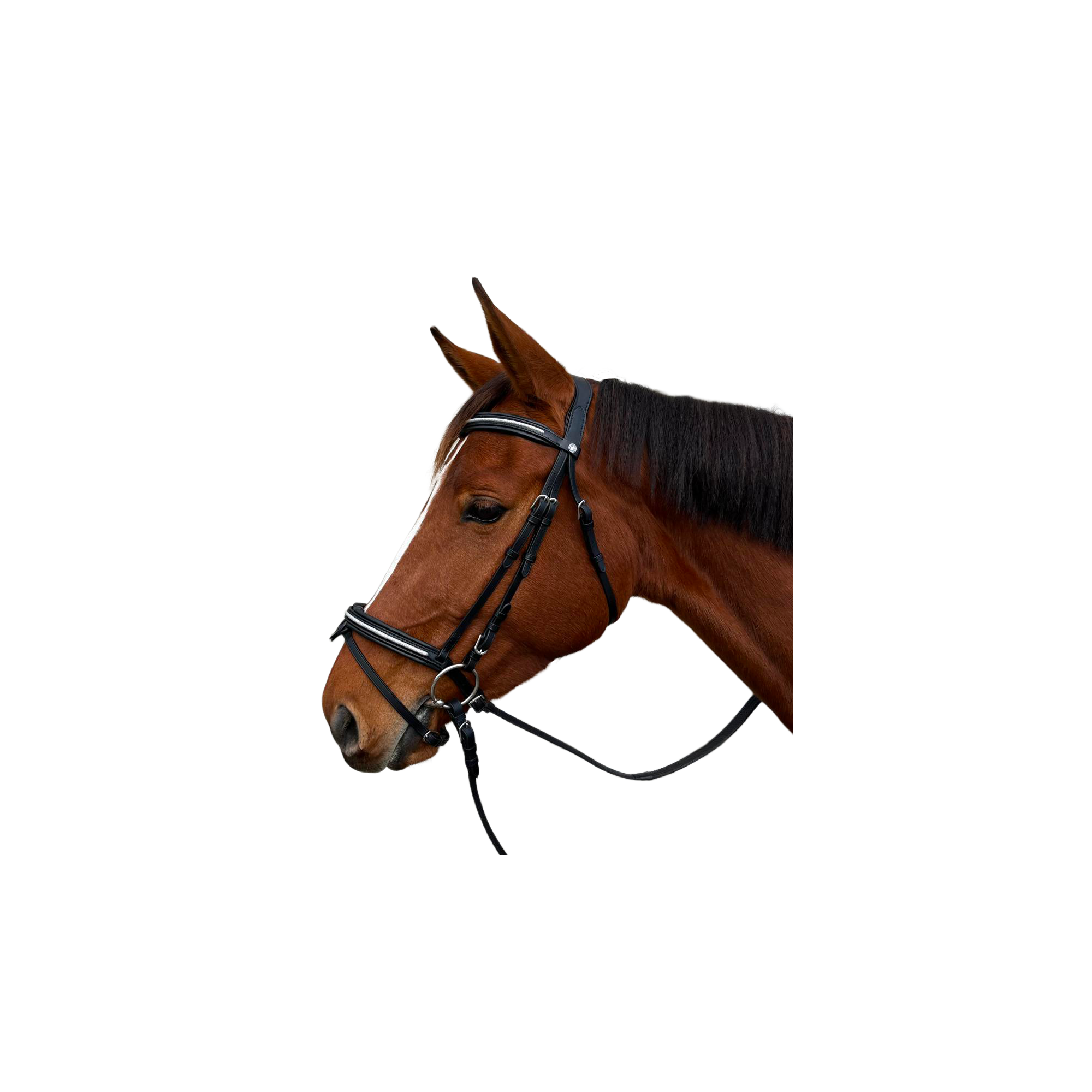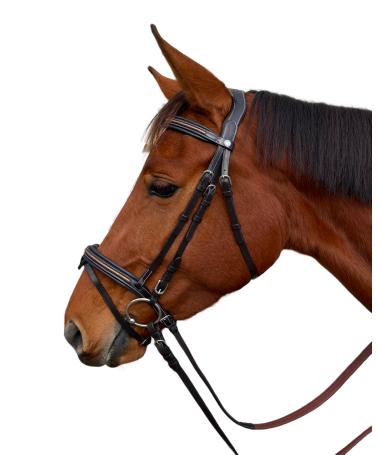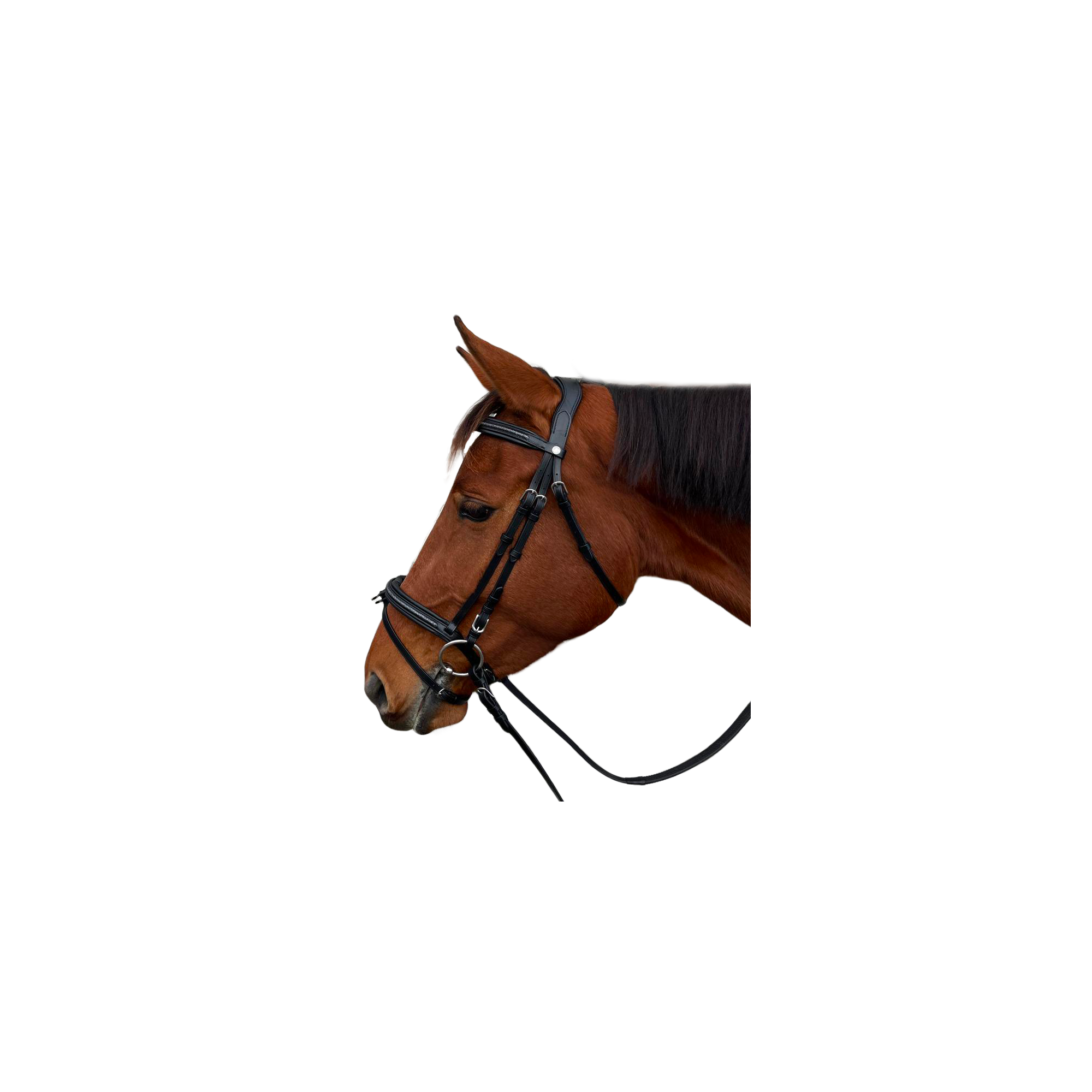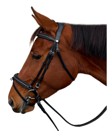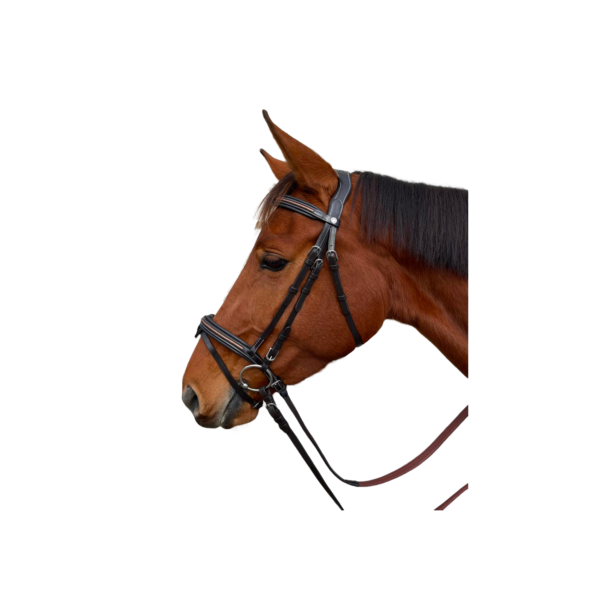 Bridon en cuir, doublé. Frontal et muserolle combinés, bombés 1/2 ronds doublés avec un jonc à paillettes. Passant de muserolle amovible. Bouclerie lyre inox. Rênes eventer.