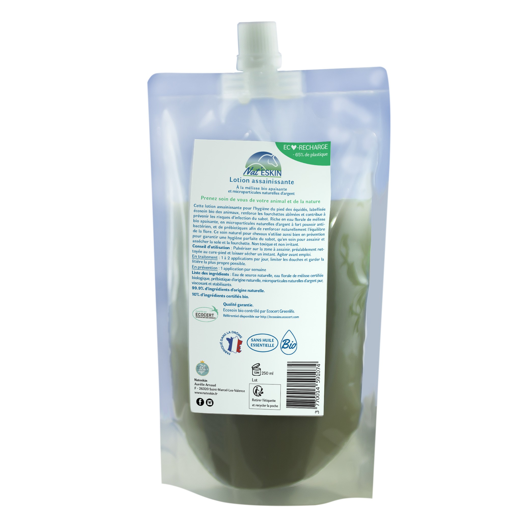 Cette lotion assainissante pour l’hygiène du pied, labellisée écosoin bio par Ecocert, renforce les fourchettes abîmées et contribue à prévenir les risques d’infection du sabot. Riche en eau florale de mélisse bio apaisante, en microparticules naturelles d’argent à fort pouvoir antibactérien, et de prébiotiques afin de renforcer naturellement l’équilibre de la flore. Ce soin naturel pour chevaux s’utilise aussi bien en prévention pour garantir une hygiène parfaite du sabot, qu’en soin pour assainir et assécher la sole et la fourchette. Non toxique et non irritant, Economique grâce à la recharge Nateskin, Ecoresponsable garanti: emballage en matière recyclée et rechargeable. Composition : Eau de source naturelle, eau florale de mélisse*, inuline, fructose, microparticules naturelles d’argent pur, viscosant et stabilisants. 99,9% d’ingrédients d’origine naturelle. *10% d’ingrédients certifiés bio soit 100% des ingrédients issus de l'agricuture qui sont certifiés bio. Qualité garantie. Ecosoin bio contrôlé par Ecocert Greenlife. Référentiel disponible sur http://ecosoins.ecocert.com. Conseils d'utilisation : Agiter avant emploi. Pulvériser sur la zone à assainir, préalablement nettoyée au cure-pied et laisser sécher un instant. En traitement : 1 à 2 applications par jour, limiter les douches et garder la litière la plus propre possible. En prévention : 1 application par semaine.