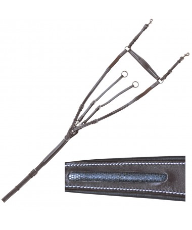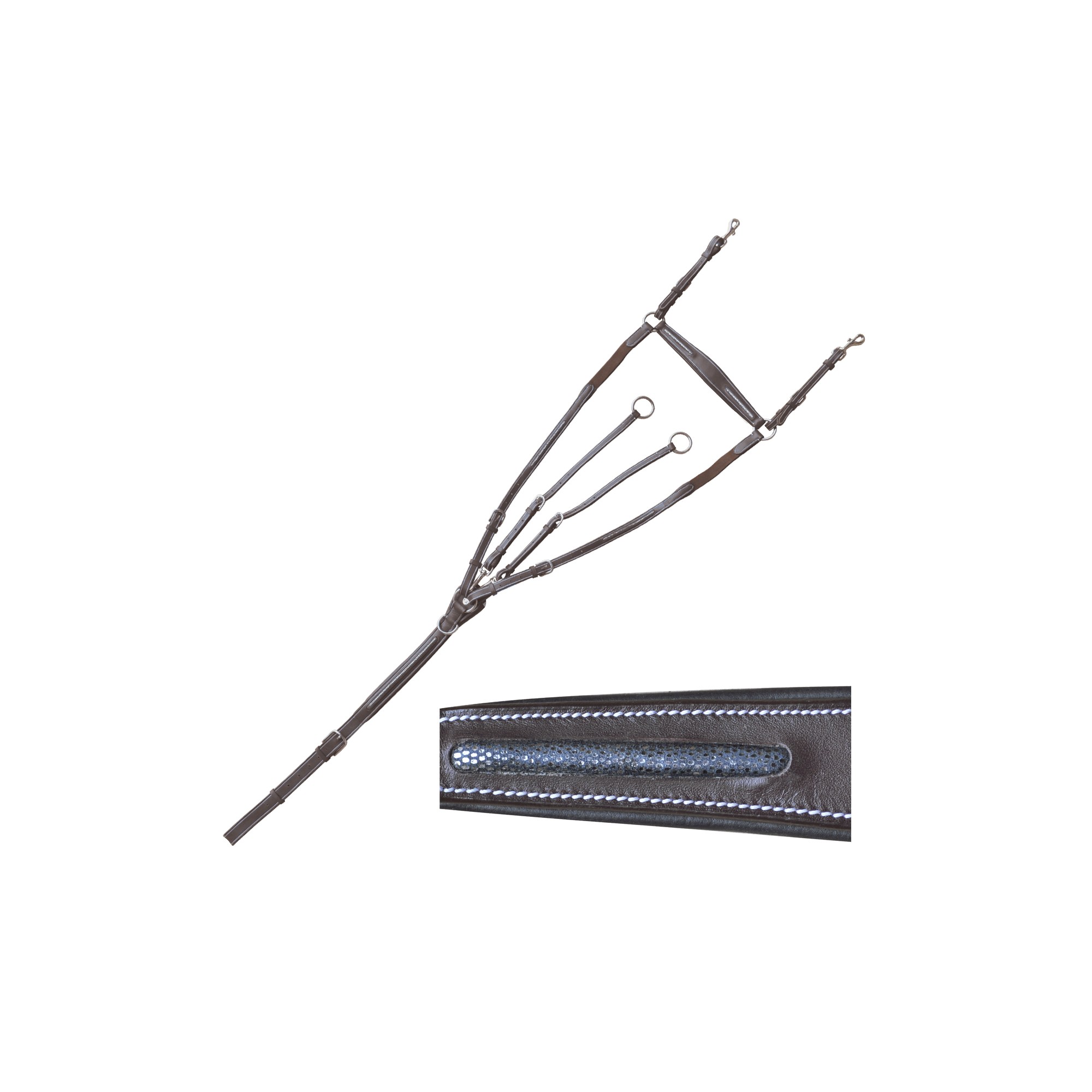 Raised, glitter and padded elastic breastplate, with bridge and running martingale. Padded breast pad with pin’s F&C. Stainless steel buckles engraved F&C.