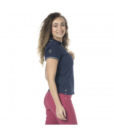 Very comfortable short sleeves polo in cotton jersey, with a V shaped button placket, for a very elegant and feminine style. Silvered striped rib collar, placket and short sleeves endings.