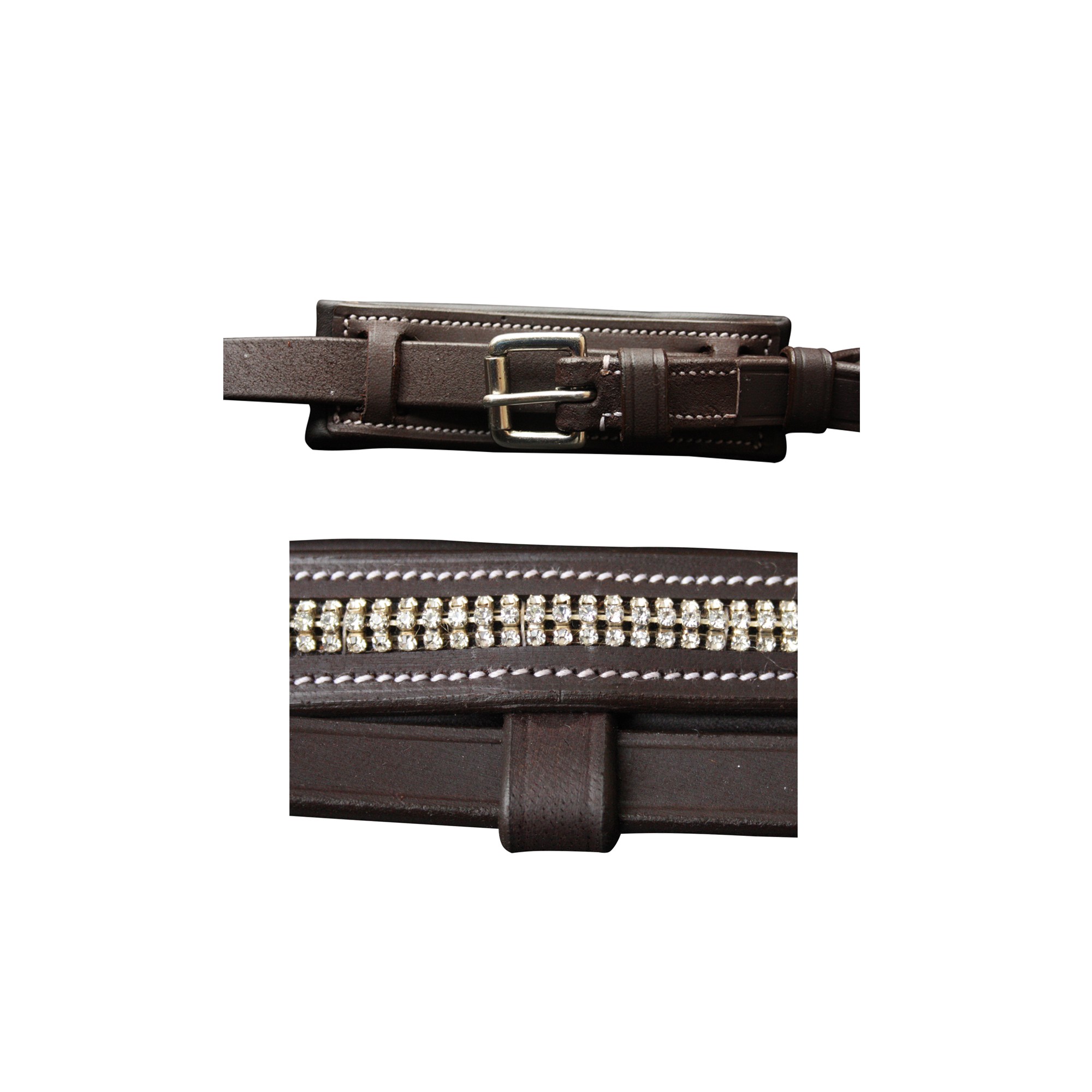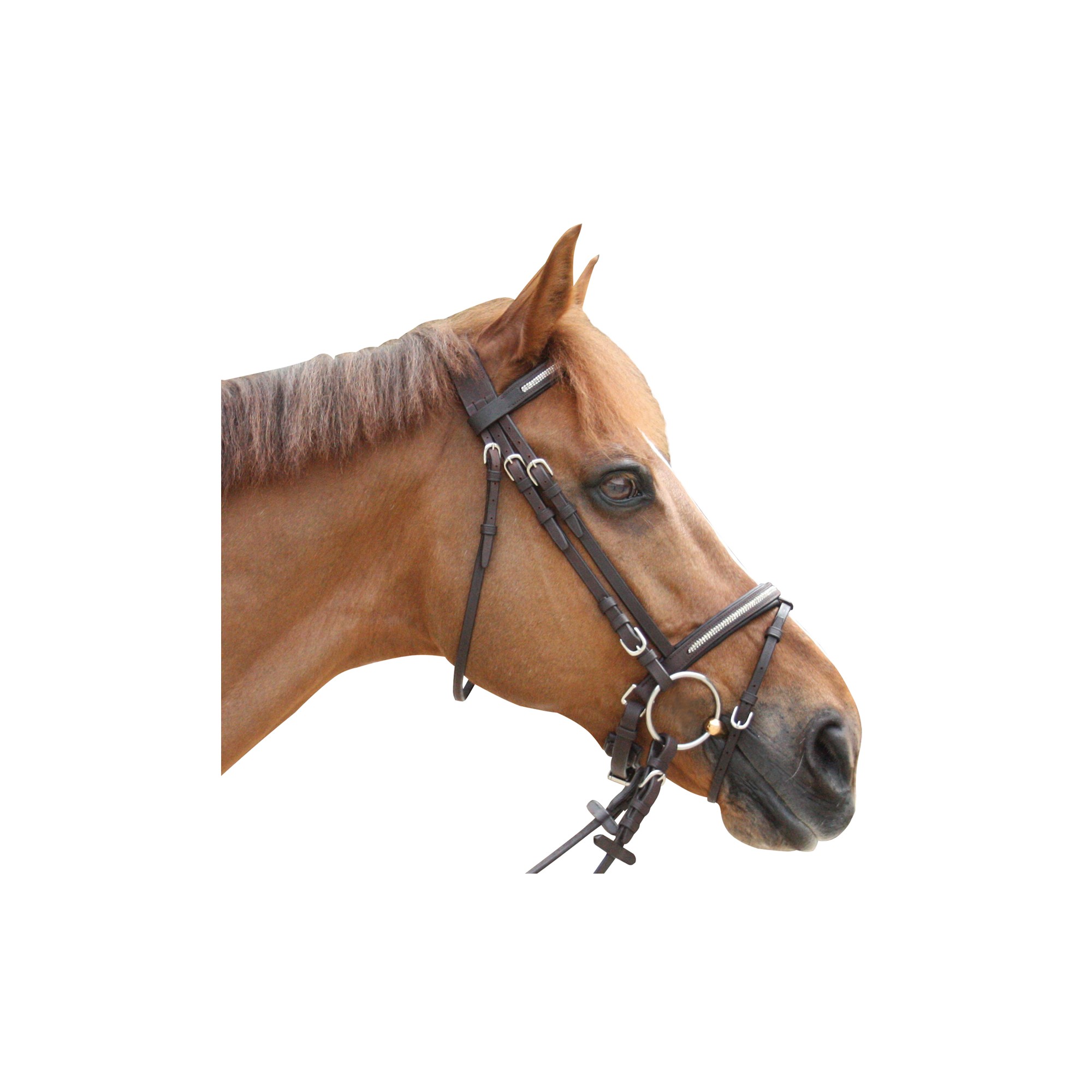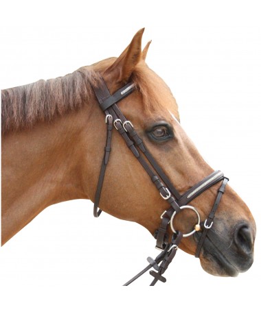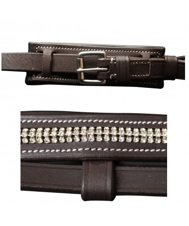 Pull Back noseband : a better distribution of pressure for higher comfort of your horse ! Padded brow-band and noseband, with diamonds. Anatomic head-piece. Nickled Lyre buckles. Delivered with rubber grip reins.