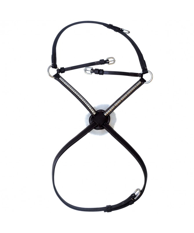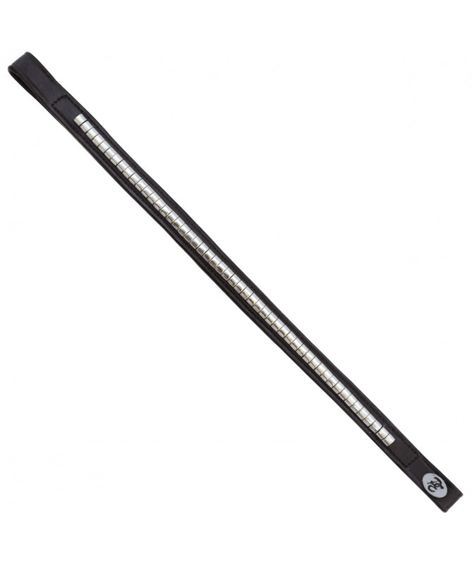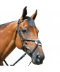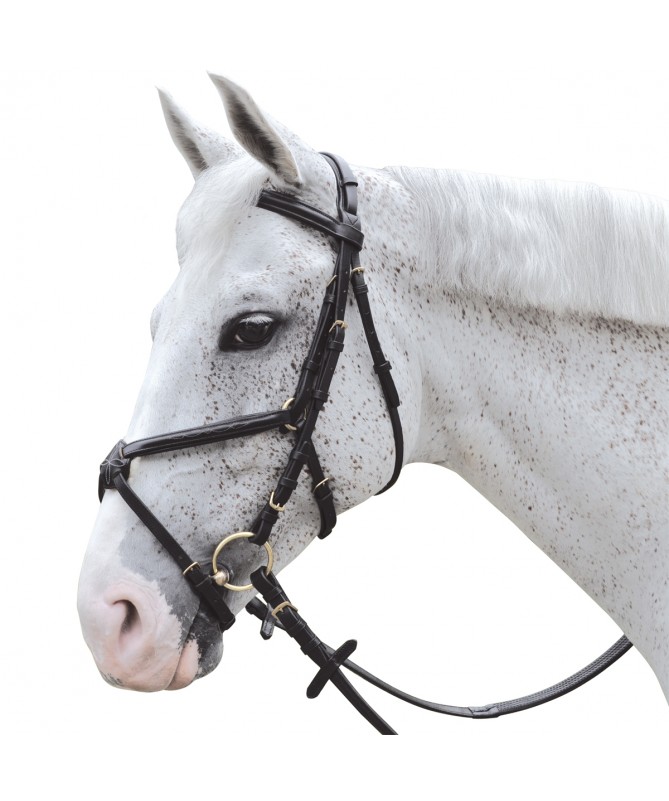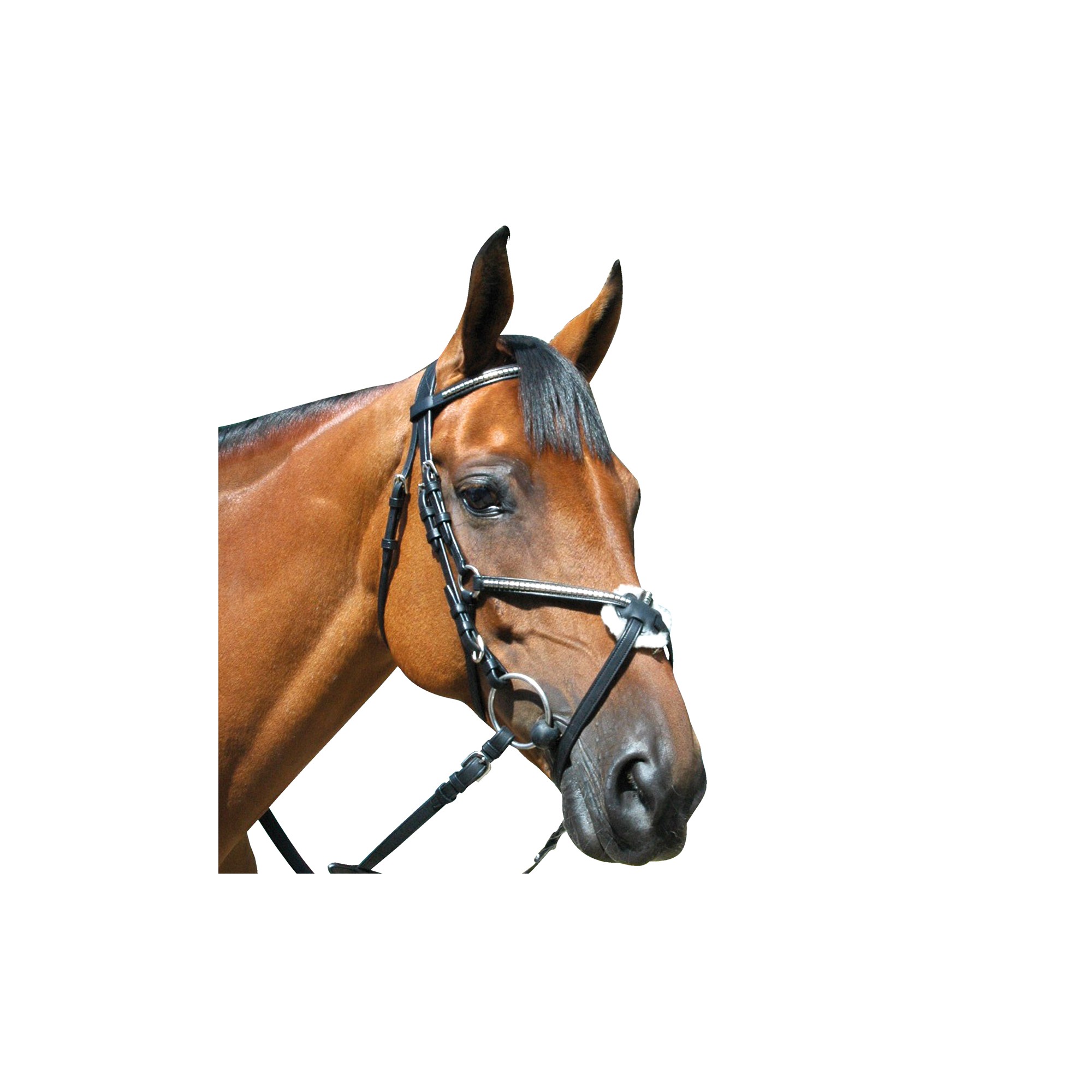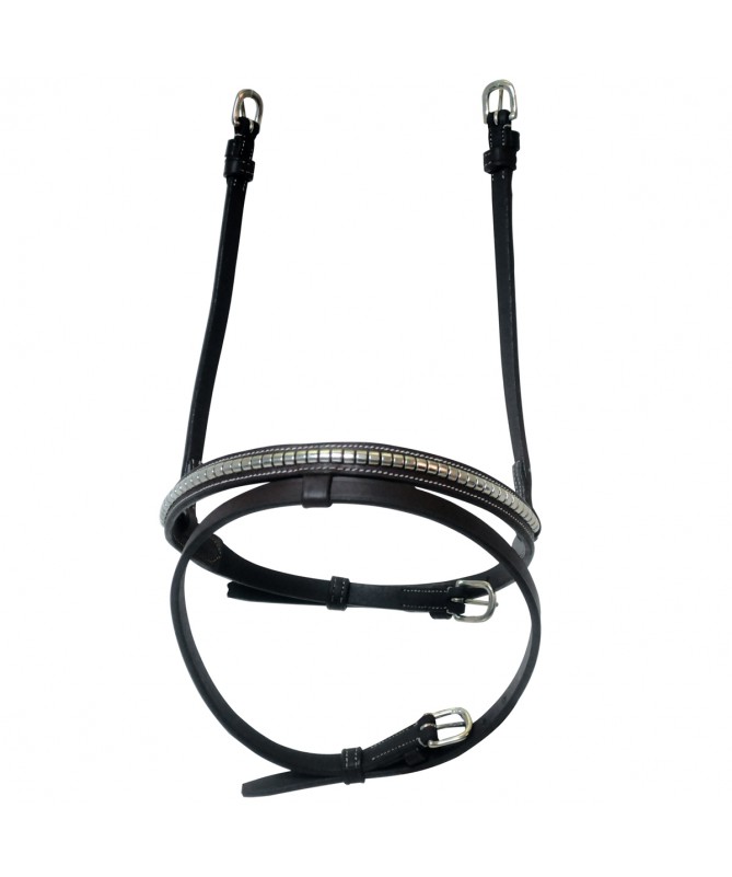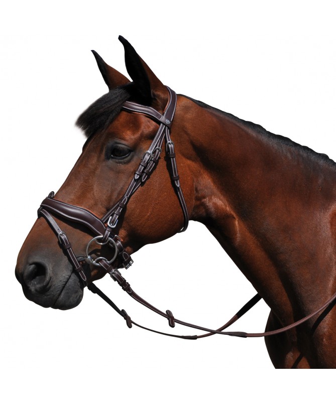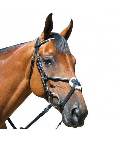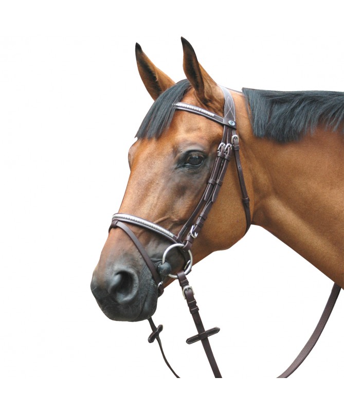 Silver clinchered brow-band and noseband. Anatomic head-piece. Nickled Lyre buckles. Delivered with rubber grip reins.