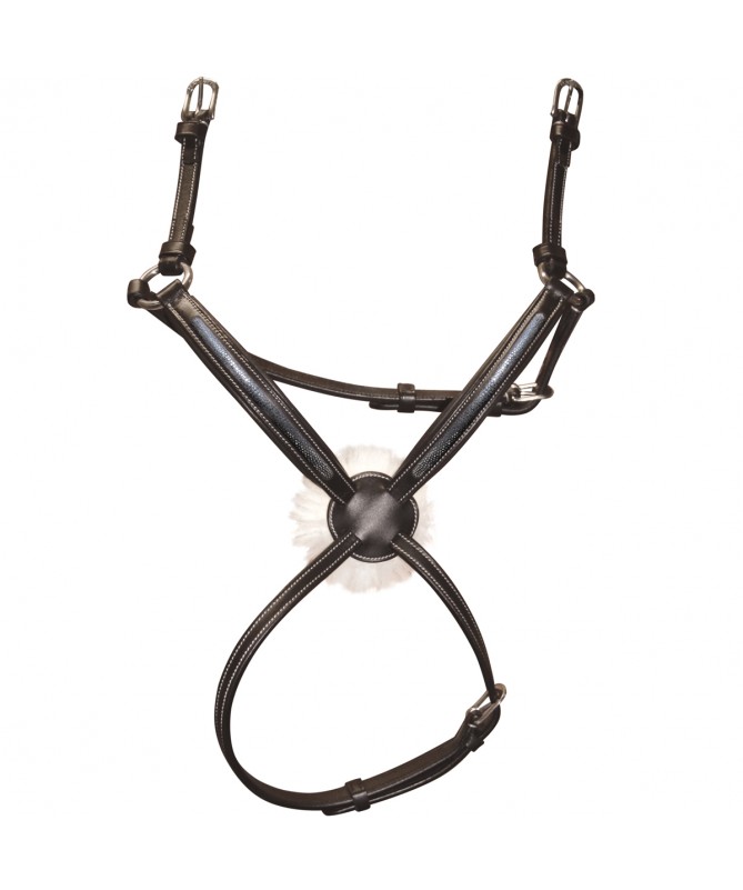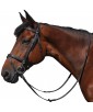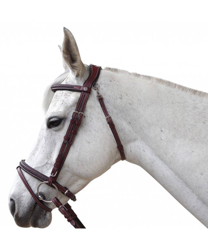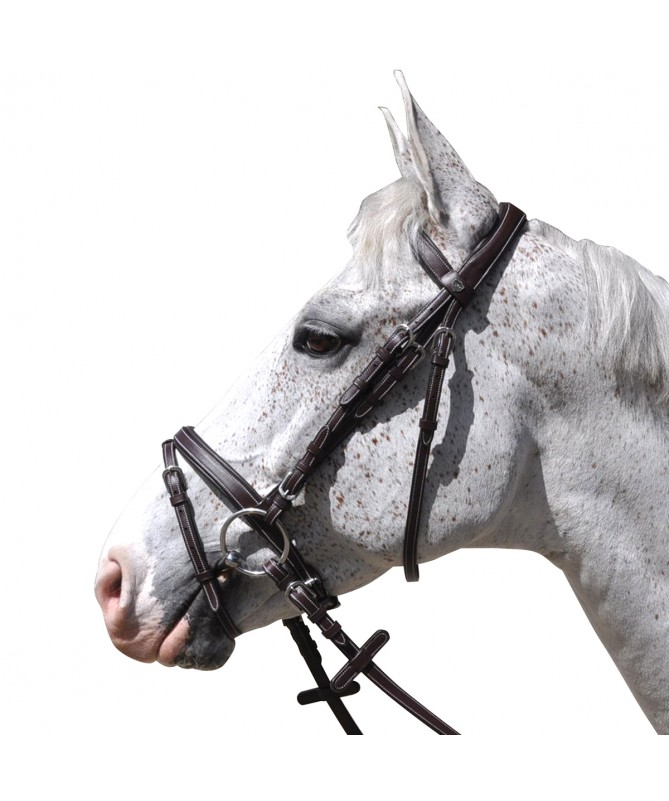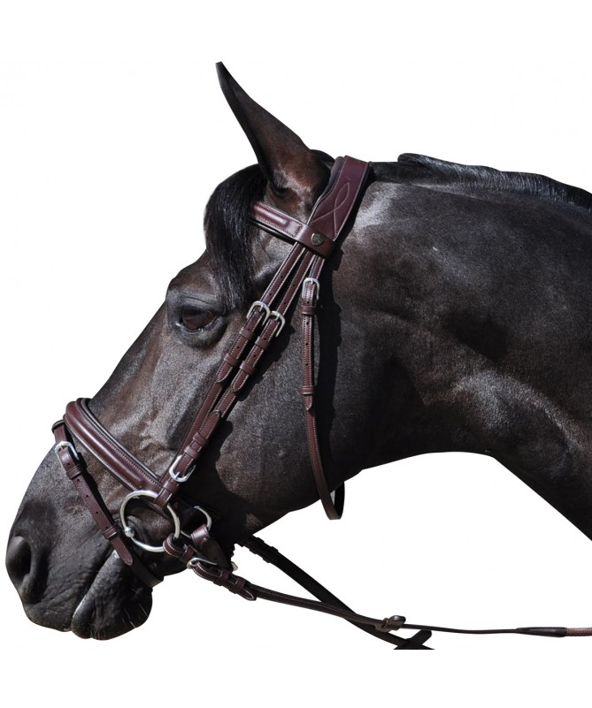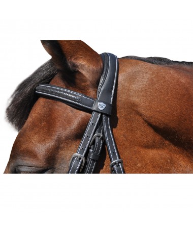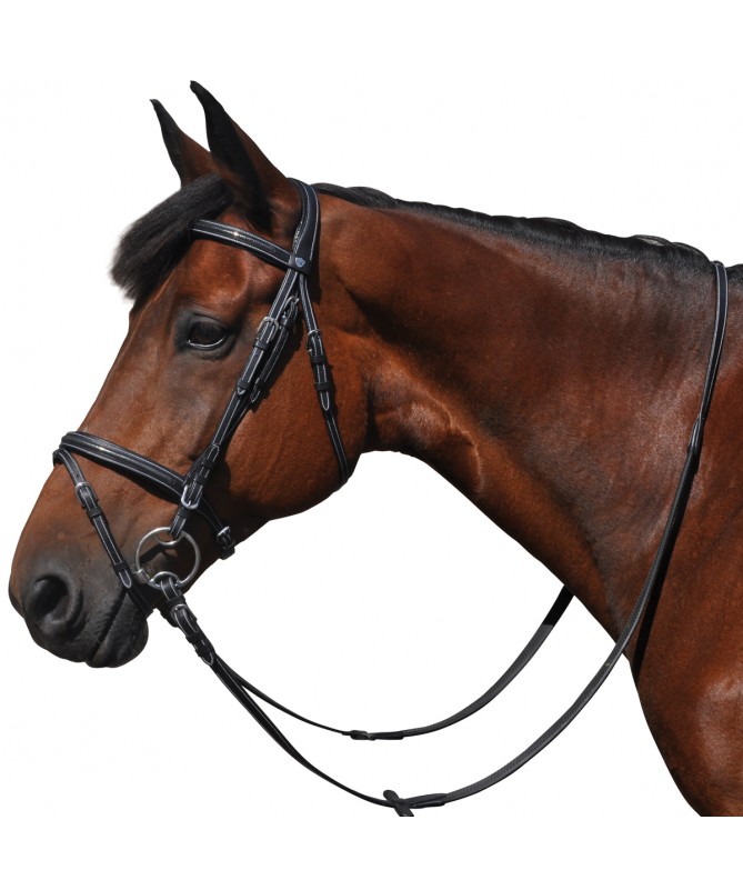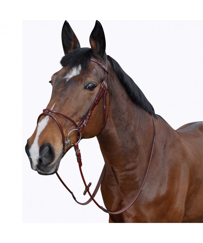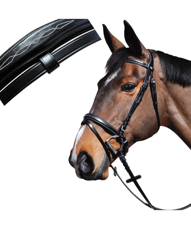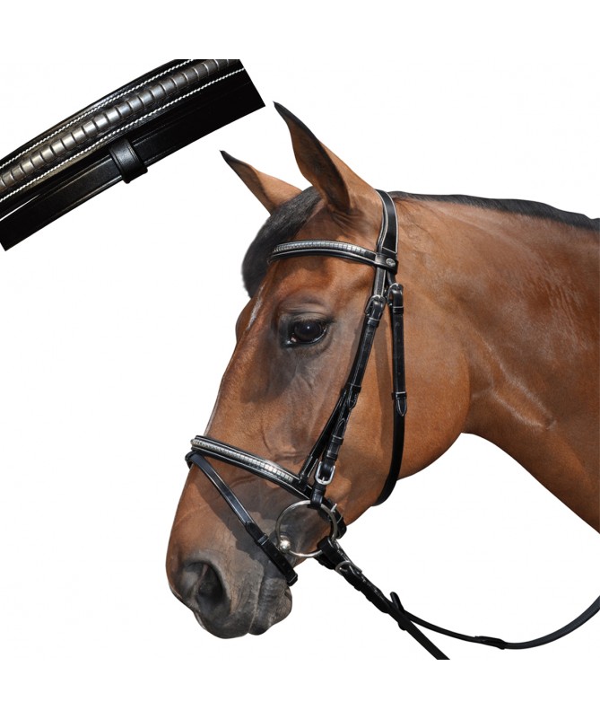 Brow-band and flash noseband, padded and glitter raised leather. Anatomic headpiece, padded and emborsed F&C. Stainless steel buckles, engraved F&C. Delivered with anti-slip soft rubber reins.